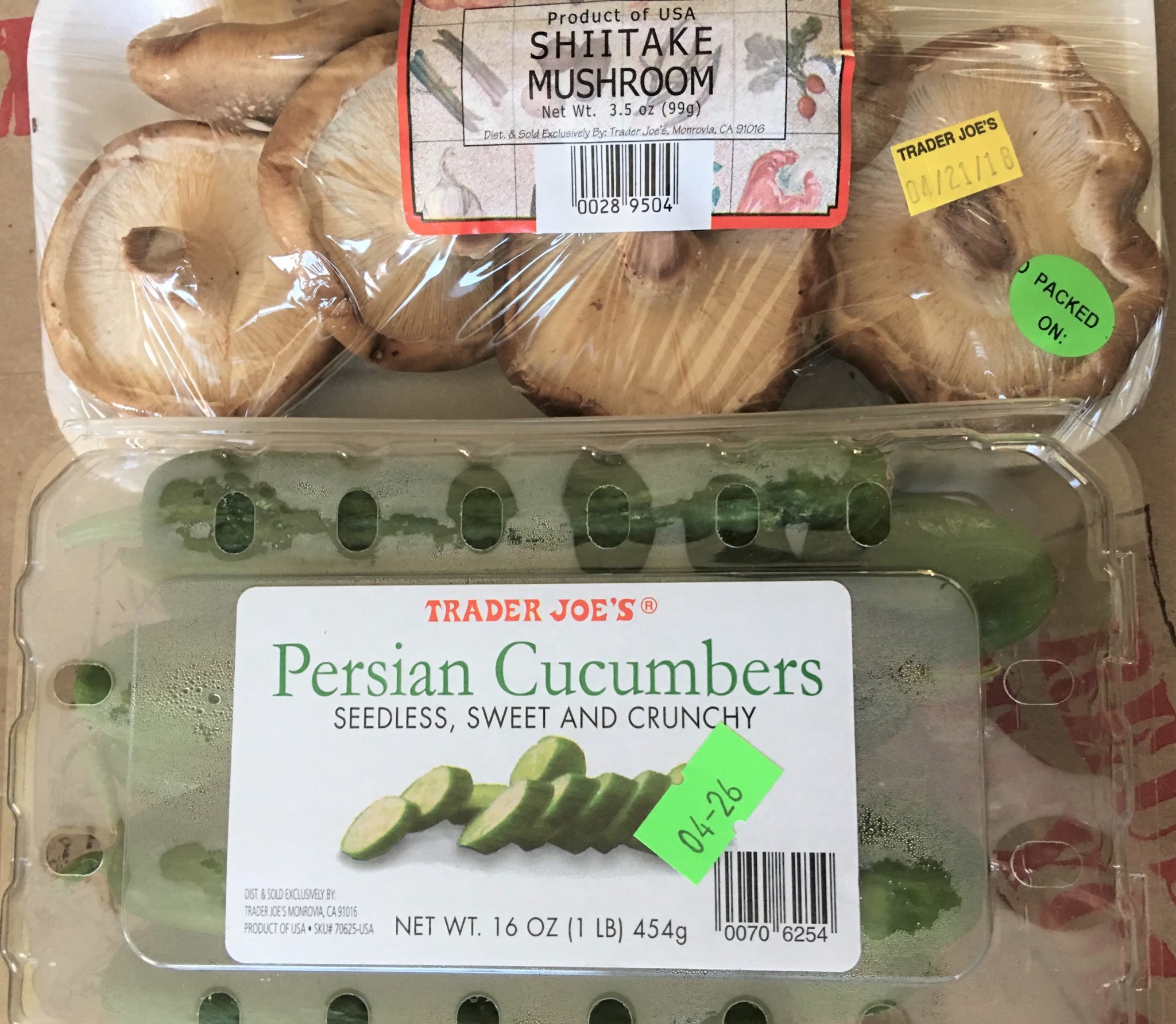 獅子唐、椎茸は新鮮で値段も手頃! キュウリはアメリカの普通のスーパーで売っているのは皮が硬く極太で水っぽいものが主流でサラダにはいいけど和食系には向かないですが、ここのPersian Cucumbersは限りなく日本のキュウリに味や食感が近いので酢の物やお漬物などに大活躍します。写真には写ってませんがEnglish Cucumbersも使えます、そしてトレジョで買うと普通のスーパーよりたいてい安い。