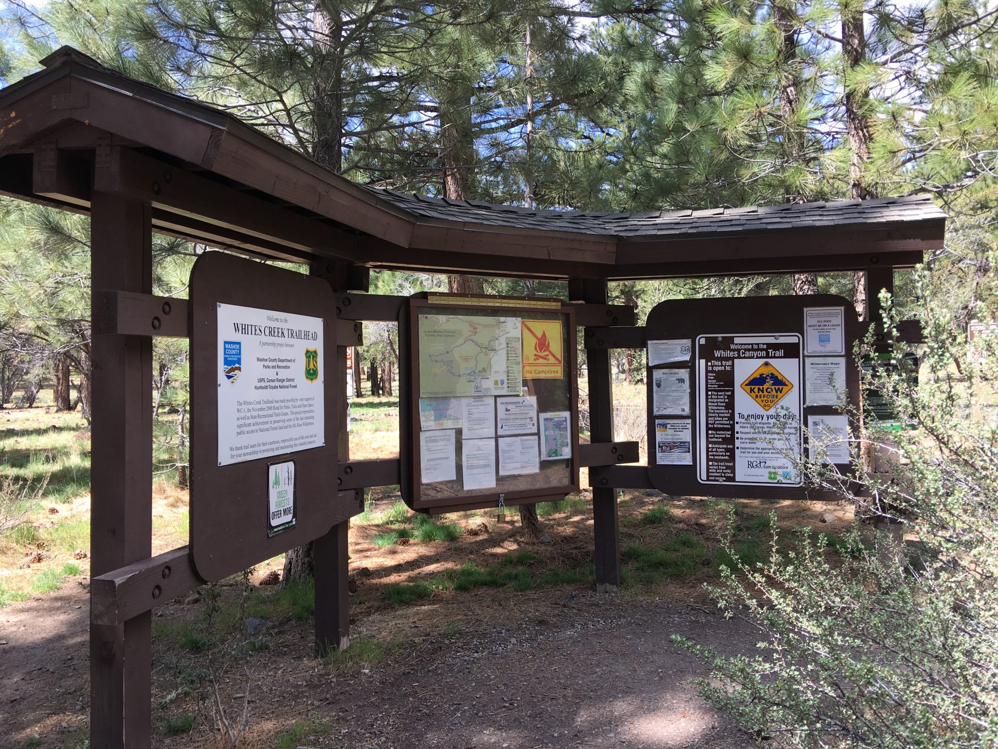 このTrailはビジターセンターのあるメインエントランスのエリアとは離れていて、Mt.Rose Hwy (州道431号線) をMt.Roseへ向かいメインエントランスよりも手前、2車線が1車線になる直前の角、Timberline Rd.を右へ入り数分で左に見える上写真の看板のところを左へ入ったWhite Creek Trailheadからのアクセスが最寄りとなります。